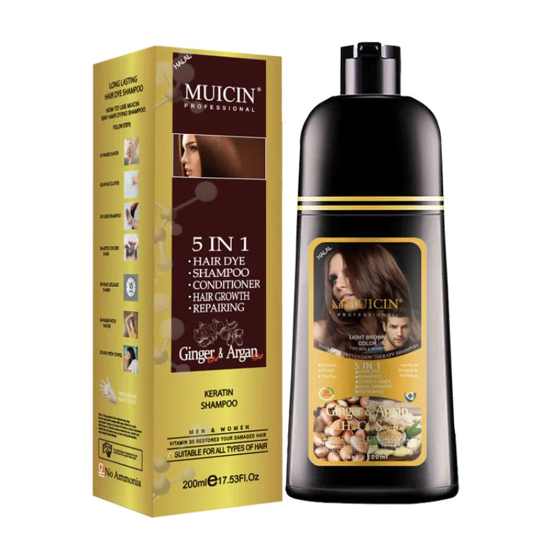 Recapture your beautiful hair with the revolutionary 5 in 1 Hair Color Shampoo with Ginger & Argan Oil - Color Refresh & Repair. This no-fuss, instant coloring shampoo provides a 5-in-1 solution by acting as a hair color, conditioner, growth enhancer, repairing agent, and scalp protector. Achieve powerful, long-lasting color in just 10-15 minutes, with 100% coverage for white and grey hairs. The mild formula ensures no allergy to hair and scalp, delivering silky and shiny hair that lasts up to 6 weeks. Choose from Brown, Light Brown, or Black to refresh your hair color while strengthening and nourishing the hair and roots.
